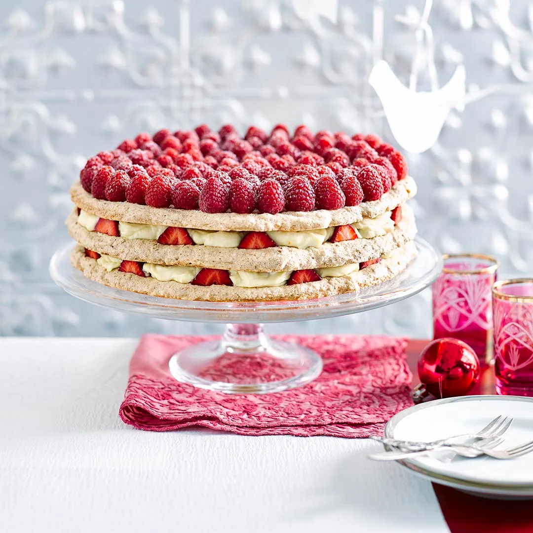 This impressive-looking almond and coconut dacquoise combines the beautiful creaminess of mascarpone cheese with sweet and tart strawberries and raspberries.