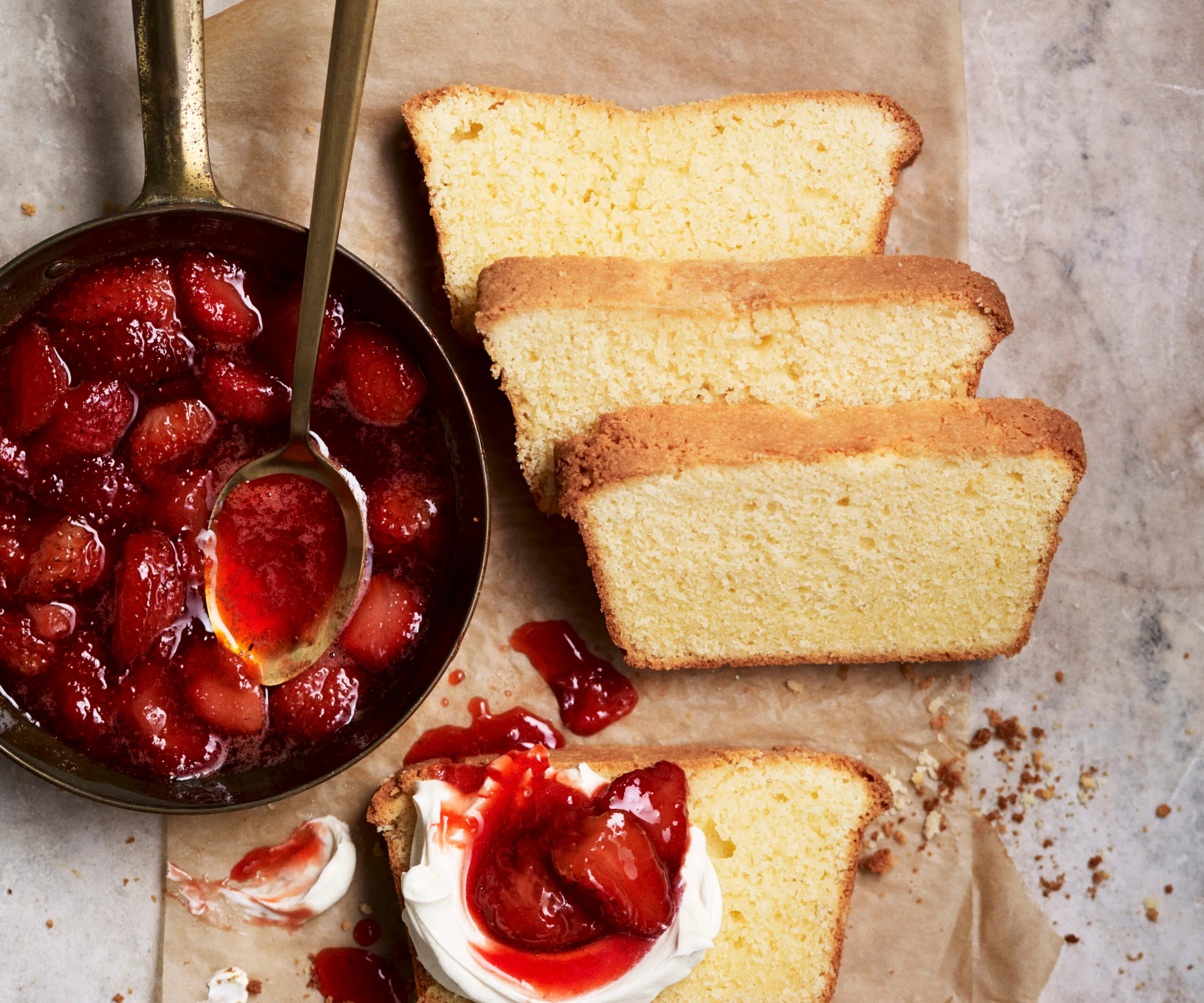 Pound cake was named based on the way it was traditionally made using a very easy formula of equal parts butter, sugar, eggs and flour – typically a pound of each, in the old language. We’ve given ours a modern twist with the inclusion of almond meal and a sweet strawberry jam.