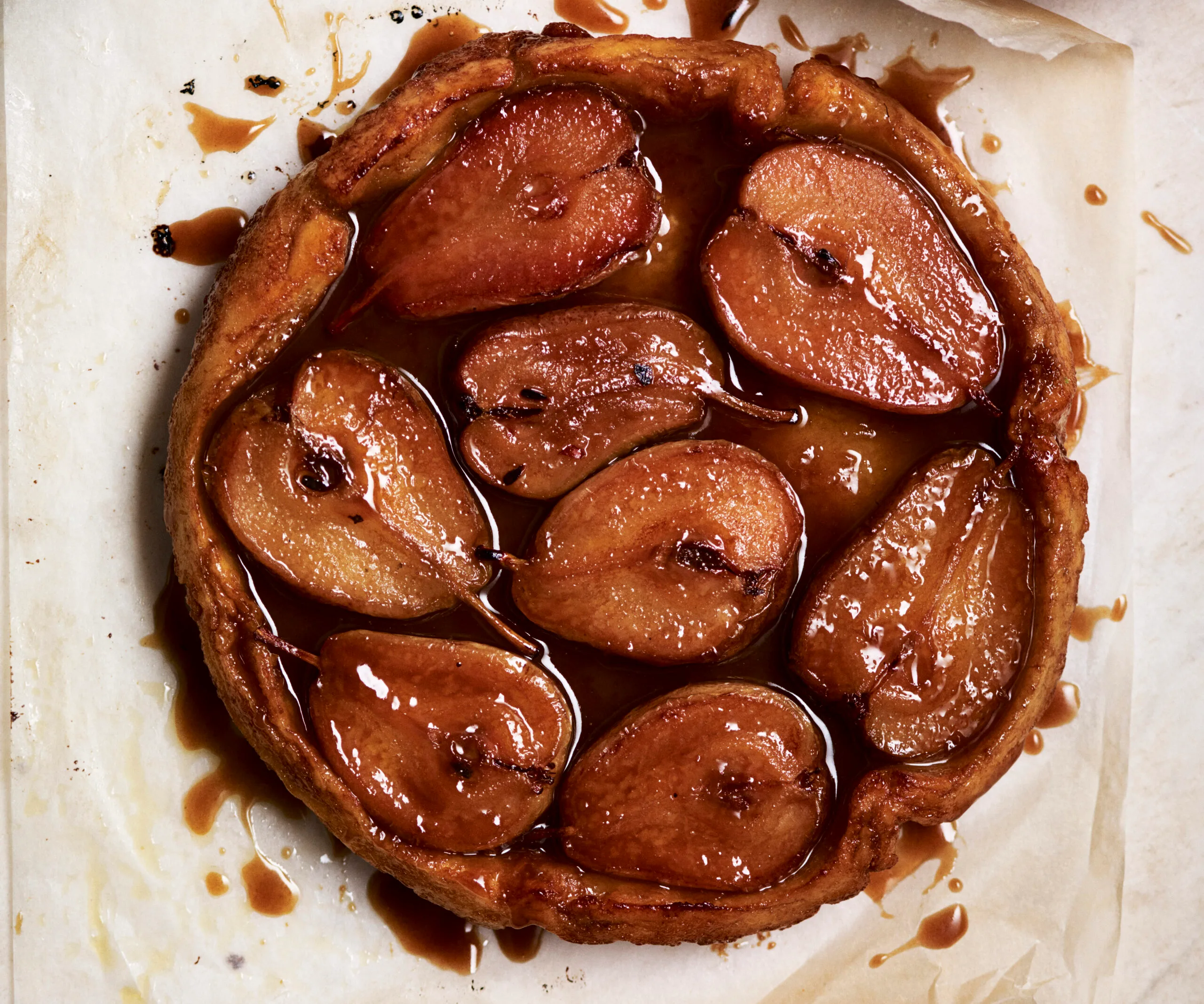5.Roll pastry out between two sheets of baking paper to 4mm (¹⁄6in) thick. Remove top paper. Cut out a 29cm (11¾in) round using a plate or large bowl as a guide. Remove pastry scraps around round. Flip pastry onto pears. Remove baking paper; tuck pastry between pears and side of pan.