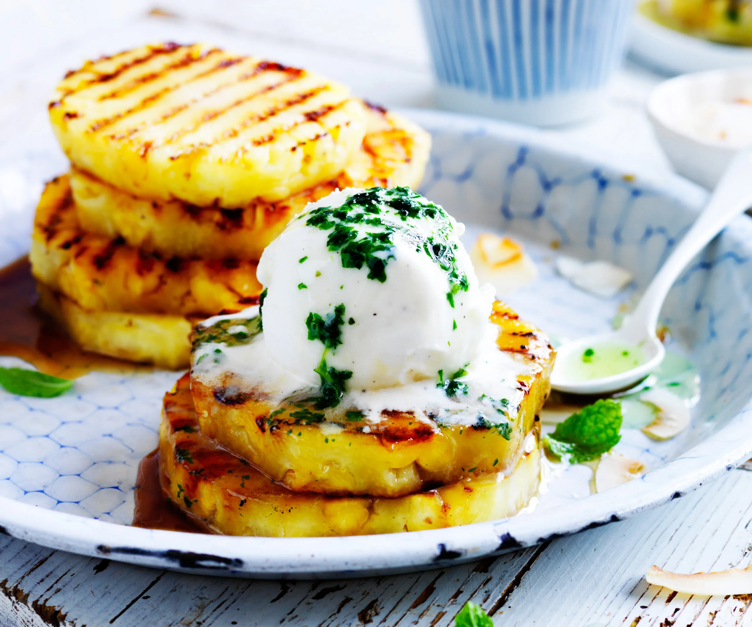 7.Divide grilled pineapple among plates; top with frozen yoghurt, drizzle with syrup. Serve sprinkled with coconut and extra mint.