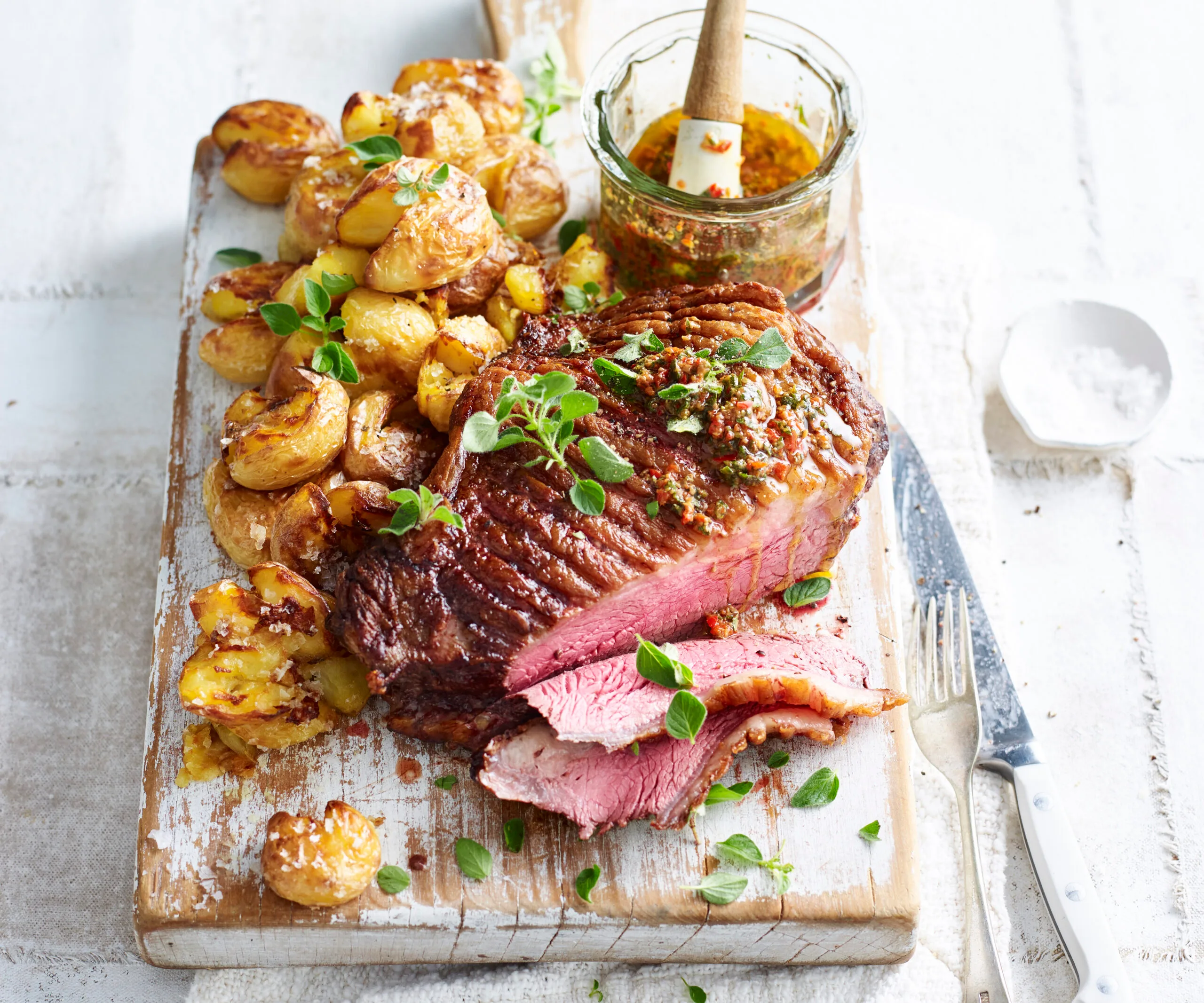Spoon vinaigrette on beef; slice beef, serve with potatoes, topped with extra oregano.