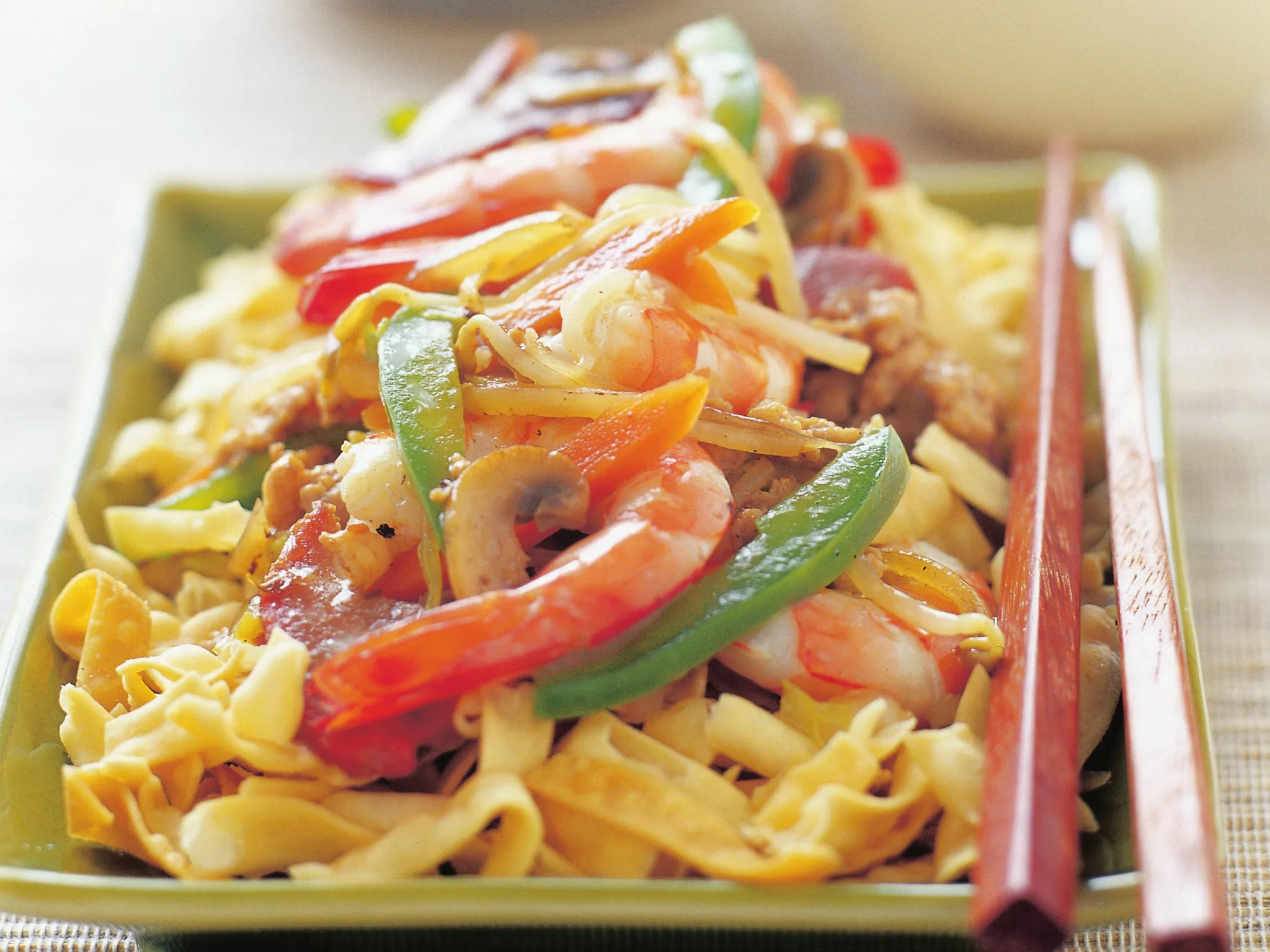 Although chow mein is traditionally made with egg noodles, you can use any noodles you like. We used packaged crunchy fried noodles – crispy egg noodles that have been deep-fried in the manufacturing process. Chinese barbecued pork is available from Asian barbecue shops. You will also need about half a small chinese cabbage for this recipe. Chinese barbecued pork has a sweet-sticky coating made from soy sauce, sherry, five-spice and hoisin sauce, and is traditionally cooked in special ovens. You can substitute soft egg noodles for the crunchy noodles, if you prefer, but check the manufacturer’s instructions regarding their preparation.