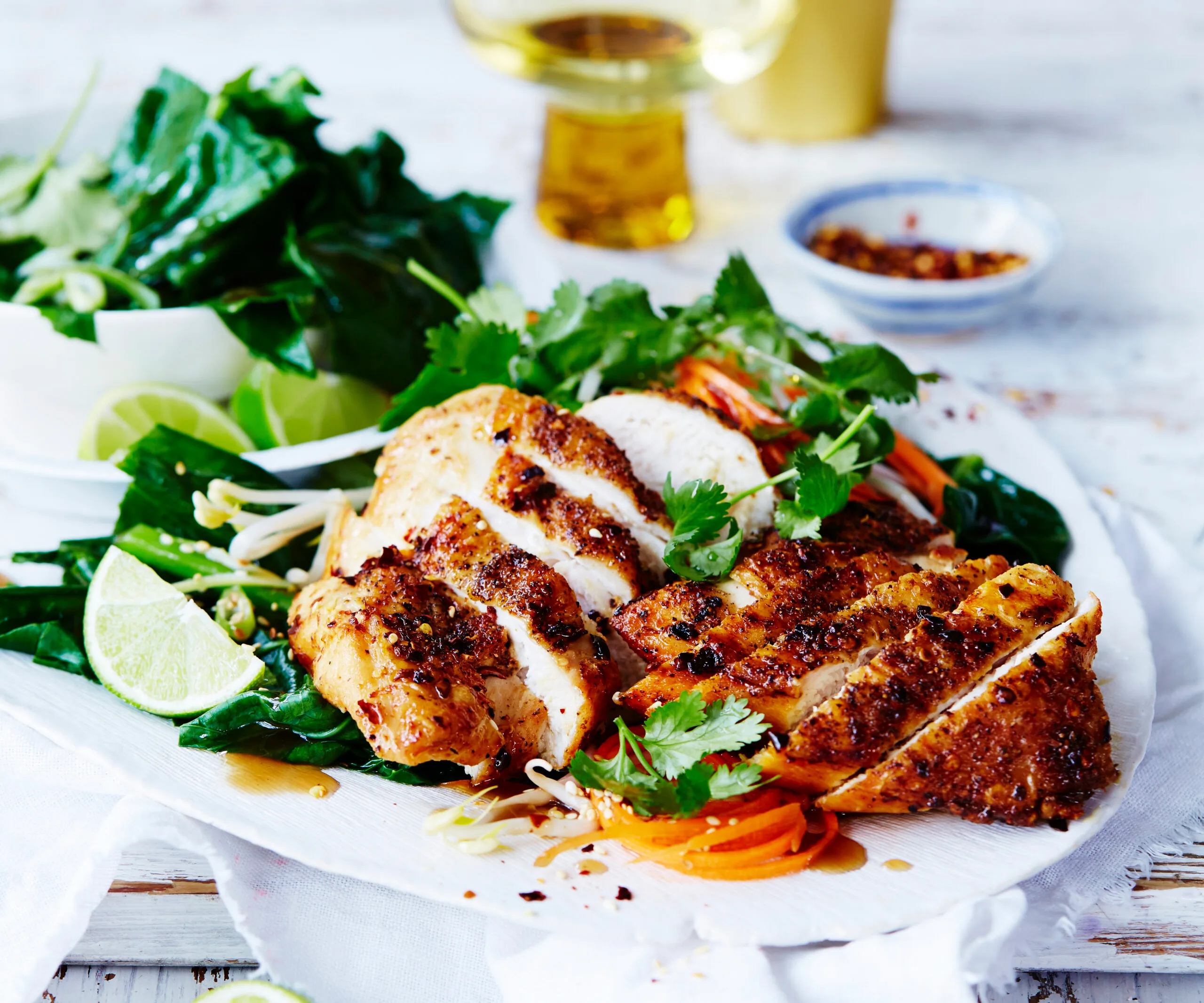 5.Serve chicken with gai lan, topped with carrot salad, sprinkled with sesame seeds. Accompany with lime wedges.