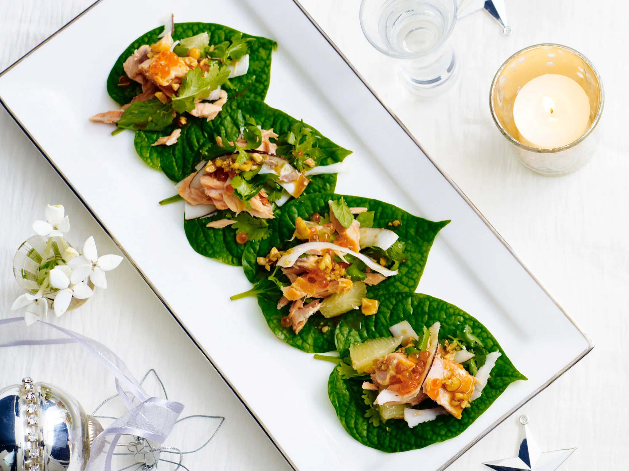 3.Place betel leaves on a serving platter; top with trout mixture. Drizzle with peanut nam jim, sprinkle with remaining herbs, peanuts and salmon roe.