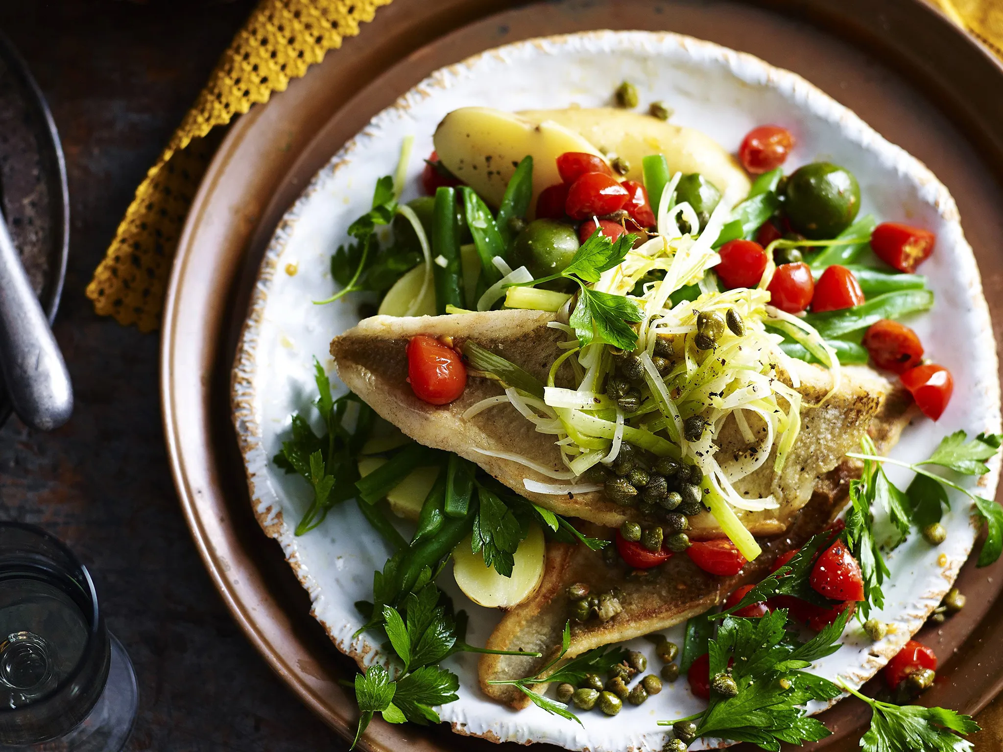 Pan-fried whiting with leek, tomato and olive salsa