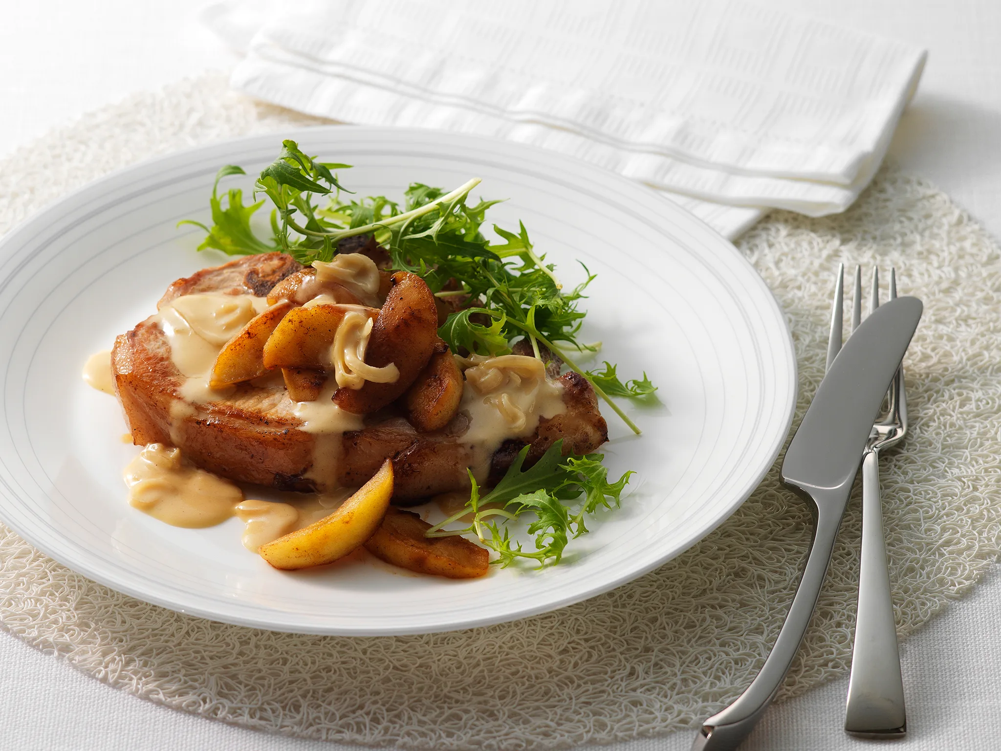 Tender pork chops with apples and calvados sauce works perfectly in this tasty dish. The family will love the gourmet spin on the classic weeknight meal.