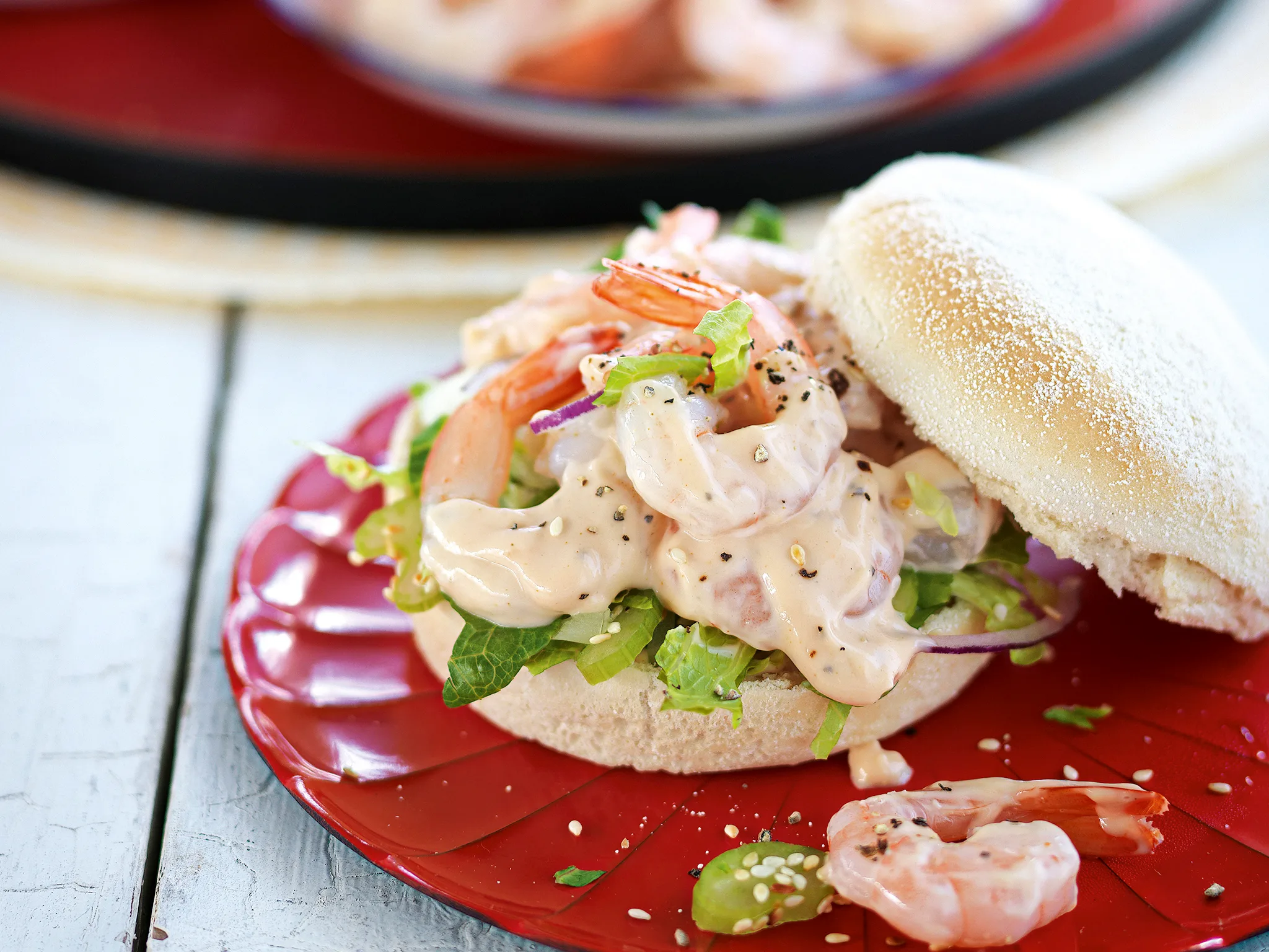 This little treat is like a prawn cocktail in a roll. The tangy dressing brings the prawns to life. Add a dash of brandy to the dressing for an adult version. These also make cute slider buns for a cocktail party.