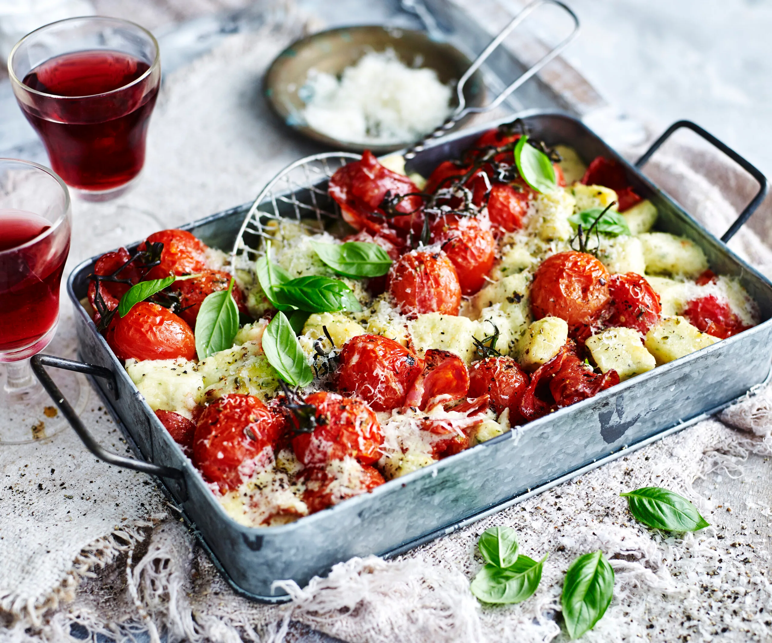 4.Cook gnocchi in two batches in a large saucepan of boiling salted water. Once gnocchi rise to the surface, cook for a further 1 minute. Using a slotted spoon, transfer gnocchi to oven tray with tomatoes; stir to distribute gnocchi through tomato mixture.