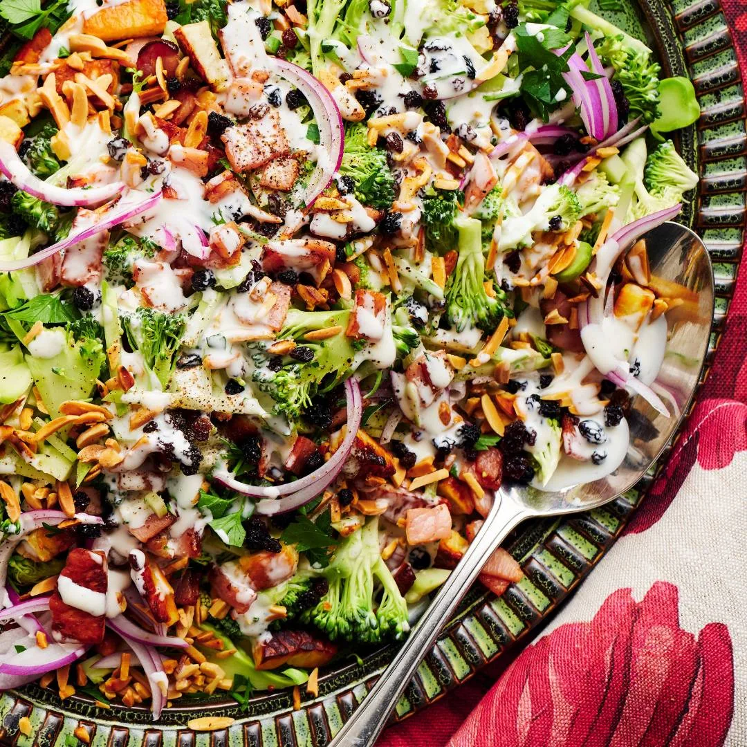 This raw broccoli salad is all about contrasts. Crisp florets and stems meet salty bacon, golden haloumi and sweet currants with a creamy lemon aioli dressing.