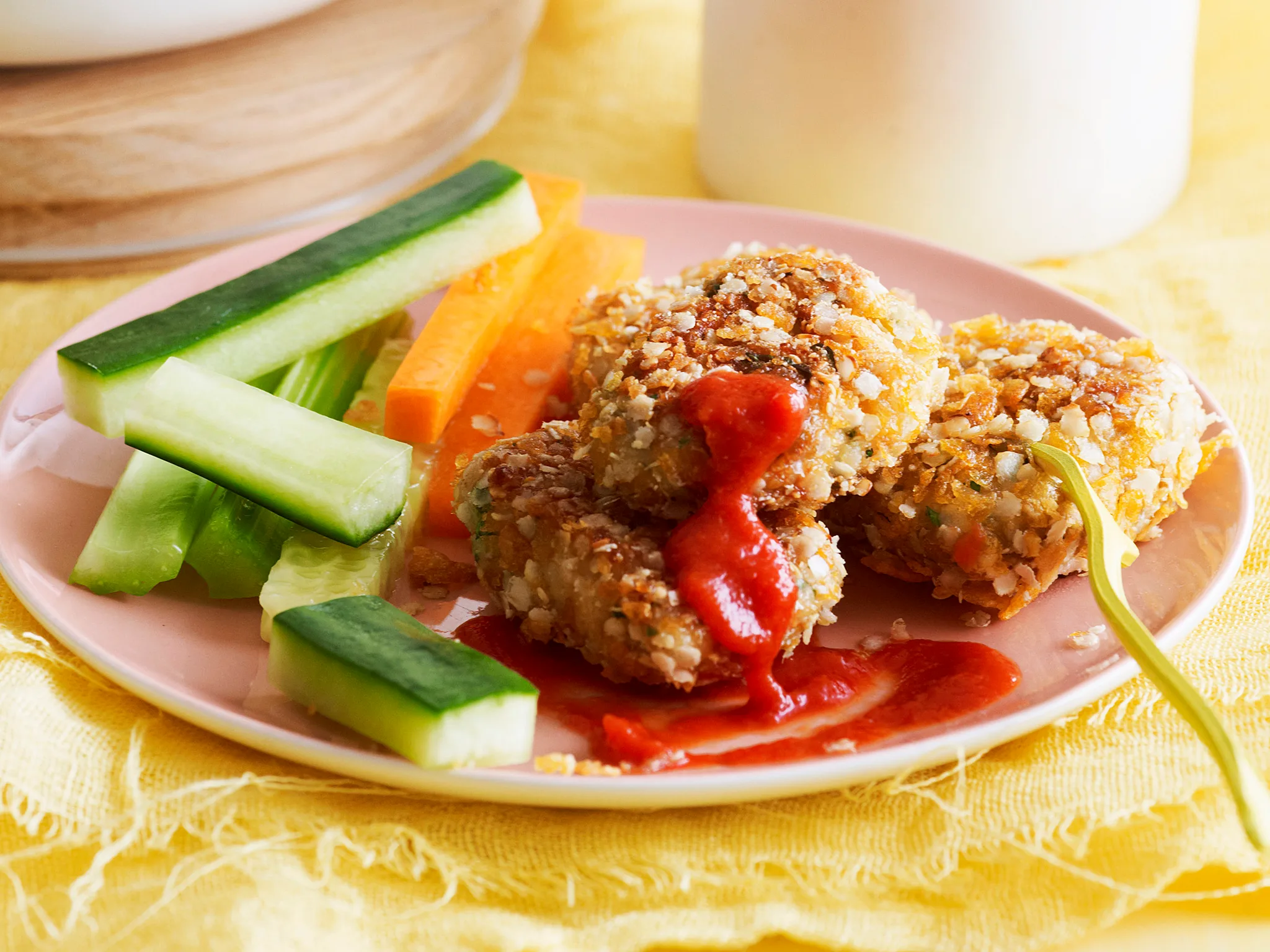 3.Roll the chicken mince mixture into small nugget shapes and coat with the remainder of the cornflake mixture.