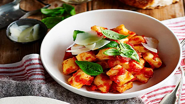 4.Bring a large saucepan of salted water to the boil. When the water is rapidly boiling, cook the gnocchi in batches. The gnocchi is cooked when it rises to the surface. Remove with a slotted spoon; drain well. Divide gnocchi between serving bowls, spoon over the tomato sauce and garnish with fresh basil leaves and parmesan cheese.