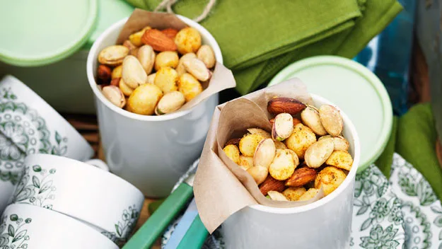 1.Preheat oven to 180°C (160°C fan-forced). In a small baking dish, combine macadamias and almonds, spice mix, salt, sugar and oil. Bake 10 minutes or until nuts are lightly browned.