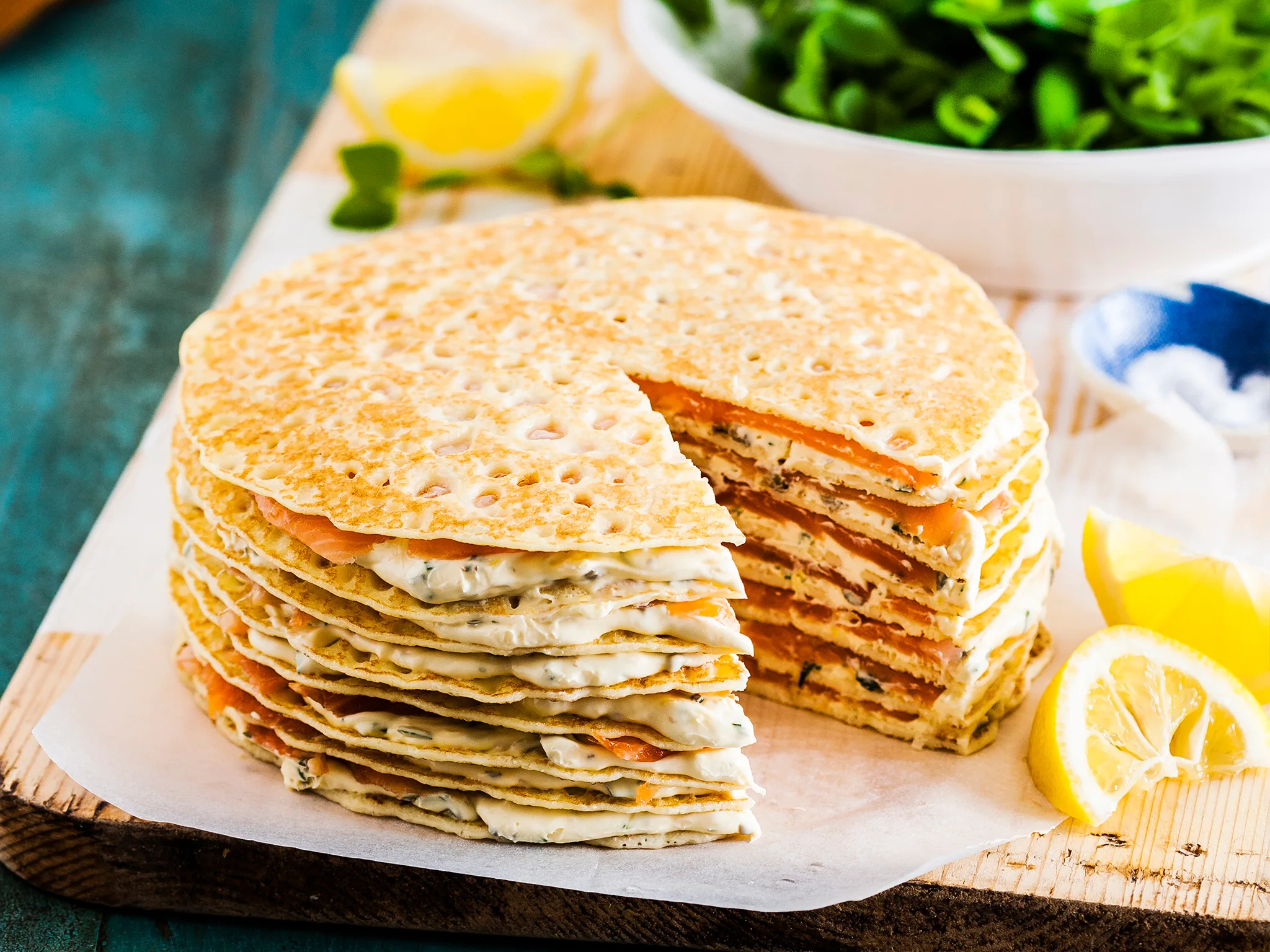 2.Place one crêpe in the cake pan; spread with about 1/3 cup of the mascarpone mixture, cover with slices of salmon. Continue layering with remaining crêpes, mascarpone mixture and salmon, finishing with a crêpe layer. Cover; refrigerate for 3 hours or until firm.