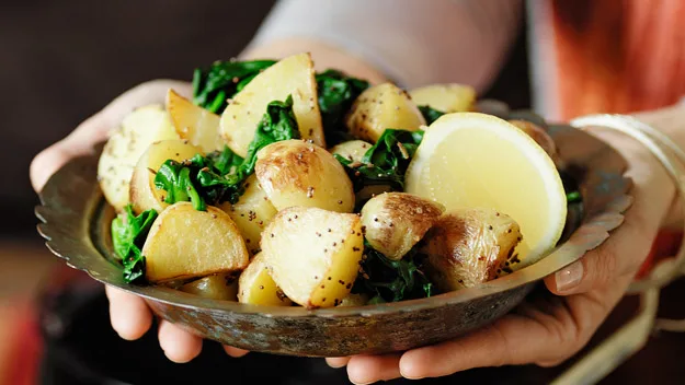 2.In a large non-stick frying pan, heat oil over high heat. Add potatoes and cook, stirring occasionally, for 10 minutes or until browned. Add mustard seeds and cook, stirring, for 30 seconds or until the seeds pop. Reduce the heat to medium; add cumin seeds and garlic, and cook, stirring, for 1 minute or until aromatic. Remove potato mixture from pan.