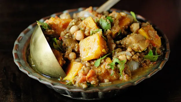 4.Meanwhile, mash half the chickpeas and lentils until a coarse paste forms. Stir into vegetable mixture, then add remaining chickpeas and lentils. Cook, uncovered, until mixture thickens slightly.