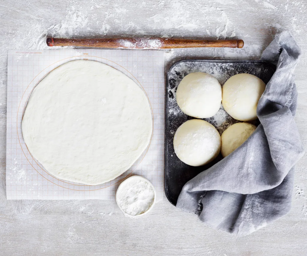 Turn dough onto a floured surface; knead until smooth. Divide dough into eight portions. Knead each portion into a ball; place onto a lightly floured oven tray. Cover, stand in warm place for 30 minutes or until risen. Roll each ball on a floured sheet of baking paper into a round.