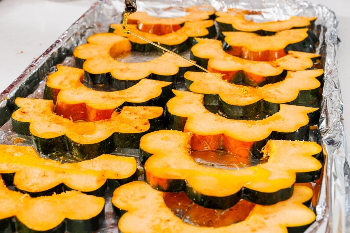 - Drizzle the squash slices with olive oil and toss to coat on both sides. Sprinkle with cinnamon, half of the salt (1/2 teaspoon) and pepper then toss again. Bake until golden brown and tender, about 25-30 minutes.