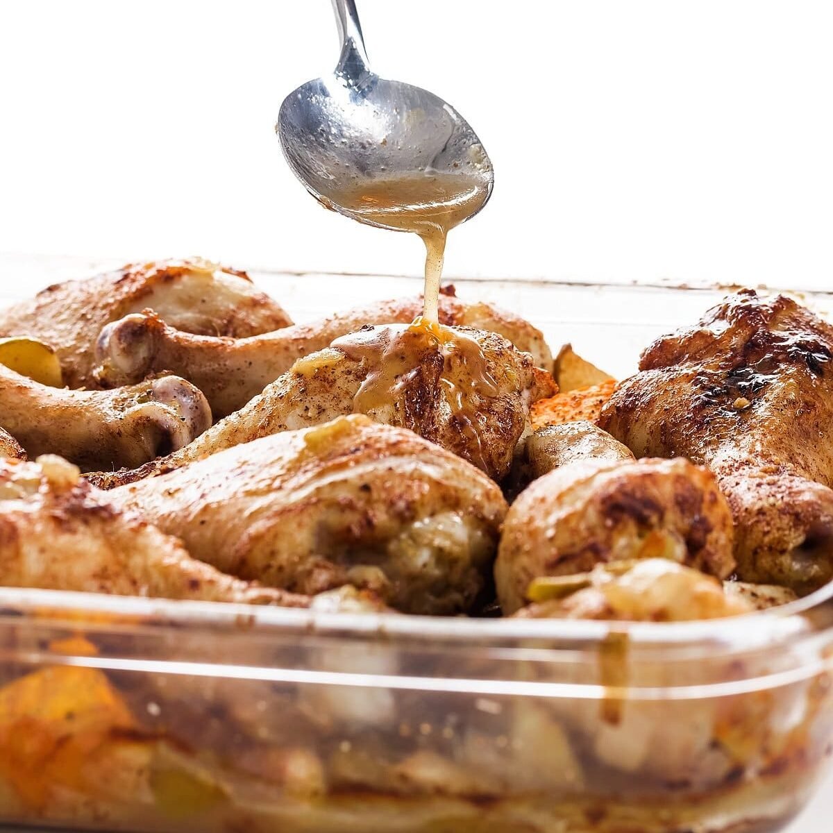- Scatter a large baking dish with the sweet potatoes, pears, onion, and garlic cloves. Top with chicken drumsticks, then drizzle everything with olive oil, cinnamon, salt, and pepper. Using hands, toss well to ensure chicken and vegetables are evenly coated In spices.