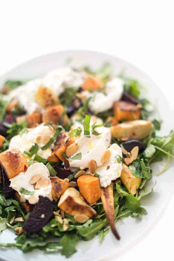 This hearty, roasted root vegetable salad recipe is made creamy burrata cheese, spicy arugula, and crunchy toasted almonds.