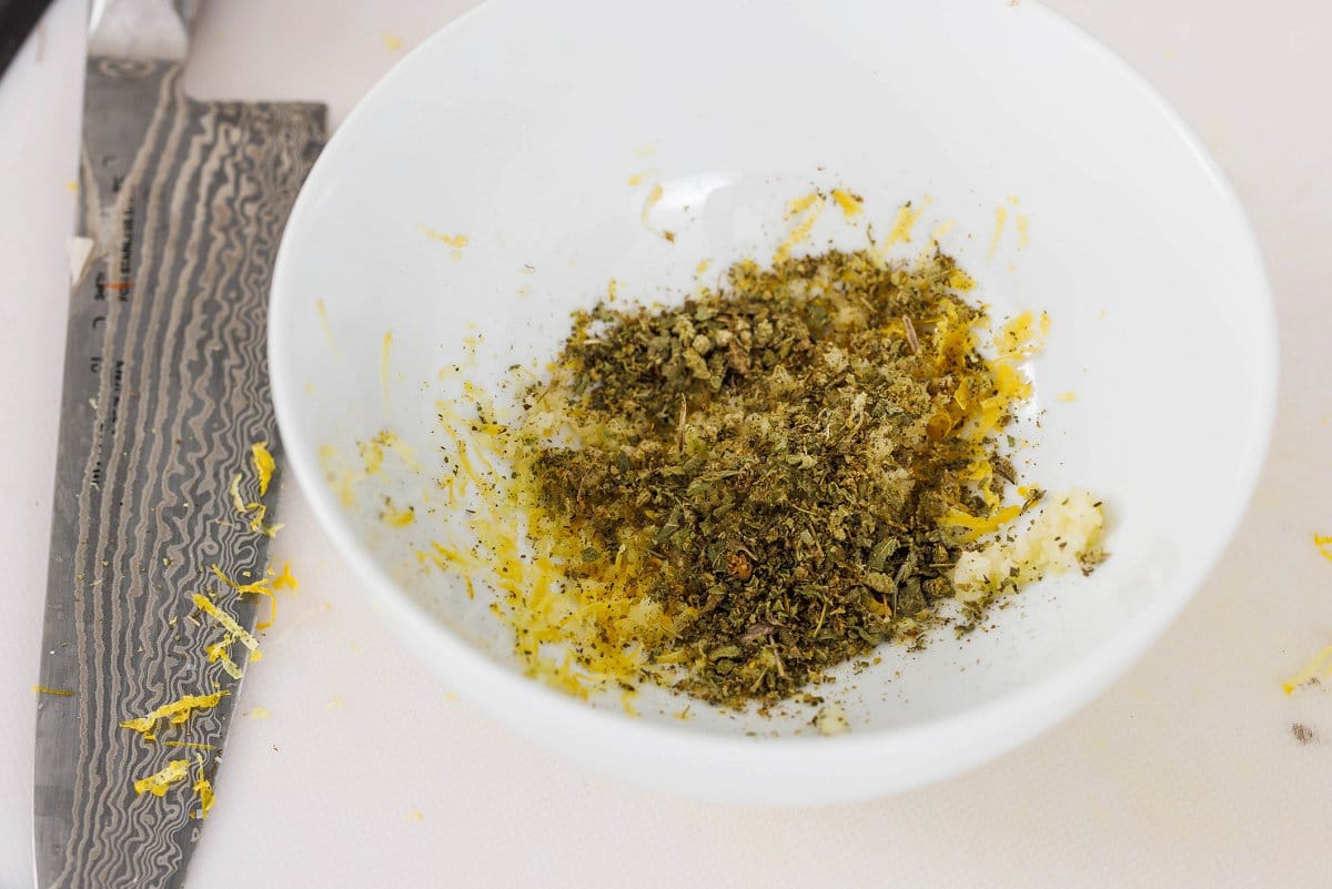 - Meanwhile, mash together lemon zest, olive oil, oregano, garlic, salt and pepper in a small bowl.