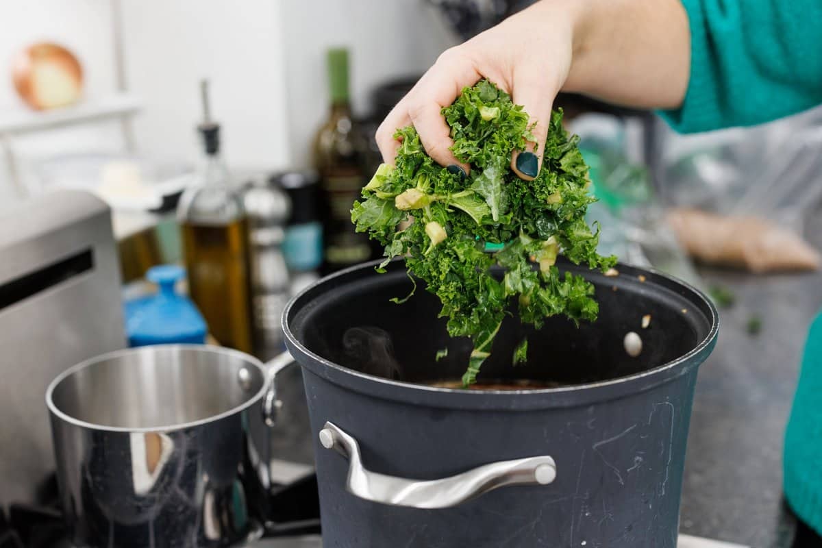 Finish with the chopped kale before reducing to a simmer, then let stew for about 20 minutes.