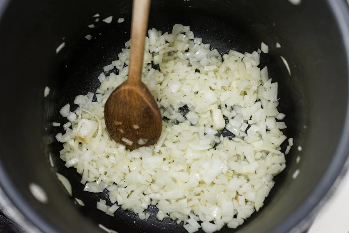 Then in the bottom of a large pot, heat some olive oil over medium-high heat and sauté the onion.