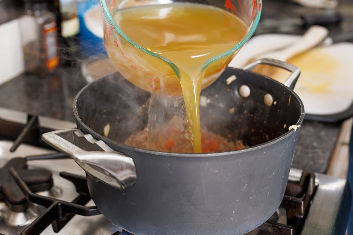 Step 7. Add the chicken broth, and use a wooden spoon to scrape up anything that might be stuck at the bottom of the pot.