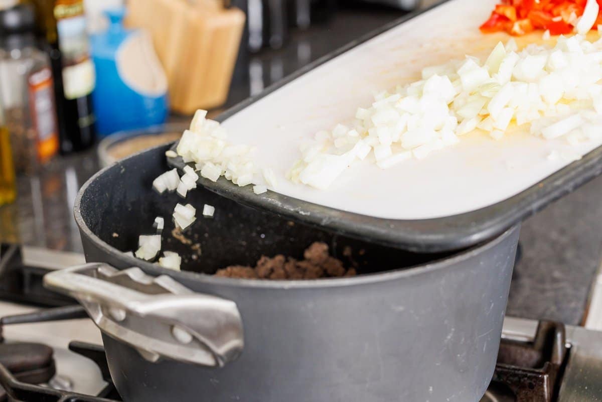 - Add garlic, diced onion, and red pepper to pan (as well as a pinch of salt and pepper) and cook until softened, about 5-6 minutes.