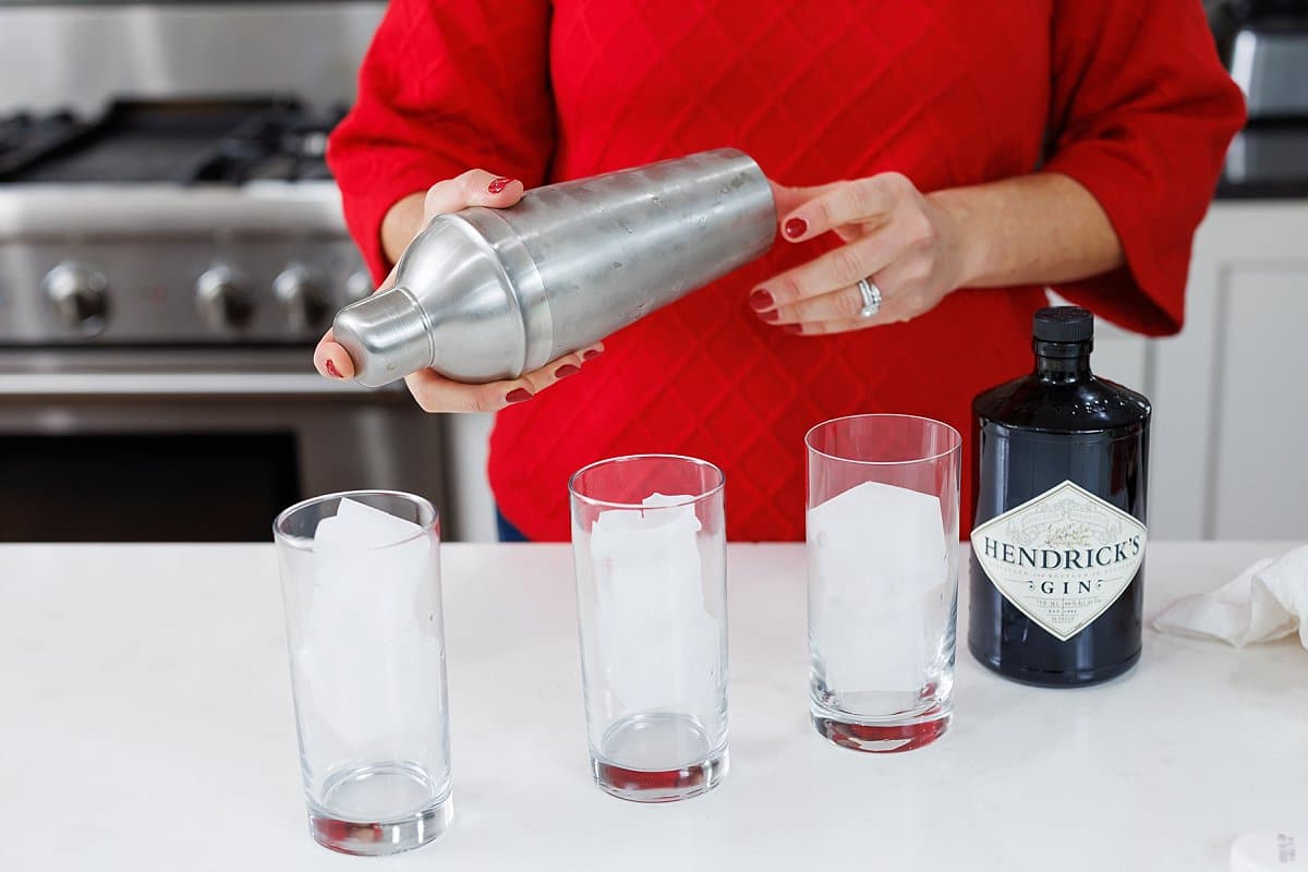 Start by filling four tall glasses with ice, and putting ice in a cocktail shaker. Then pour the cranberry juice into the shaker as well.