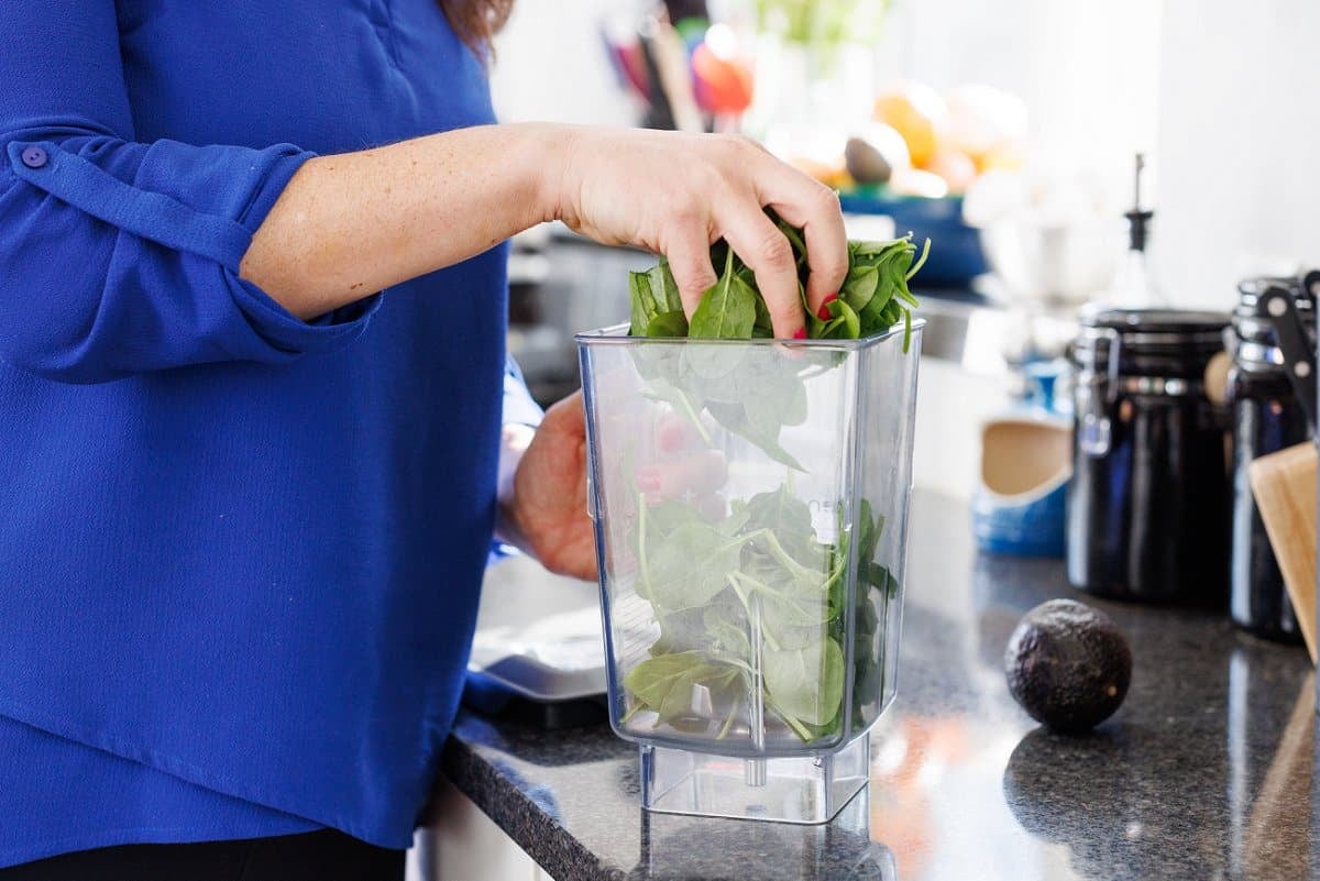 Start your shamrock shake by getting out your blender and adding the baby spinach.