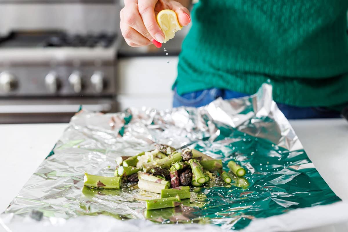 Once the lemon has been zested, juice the lemon onto the asparagus as well.