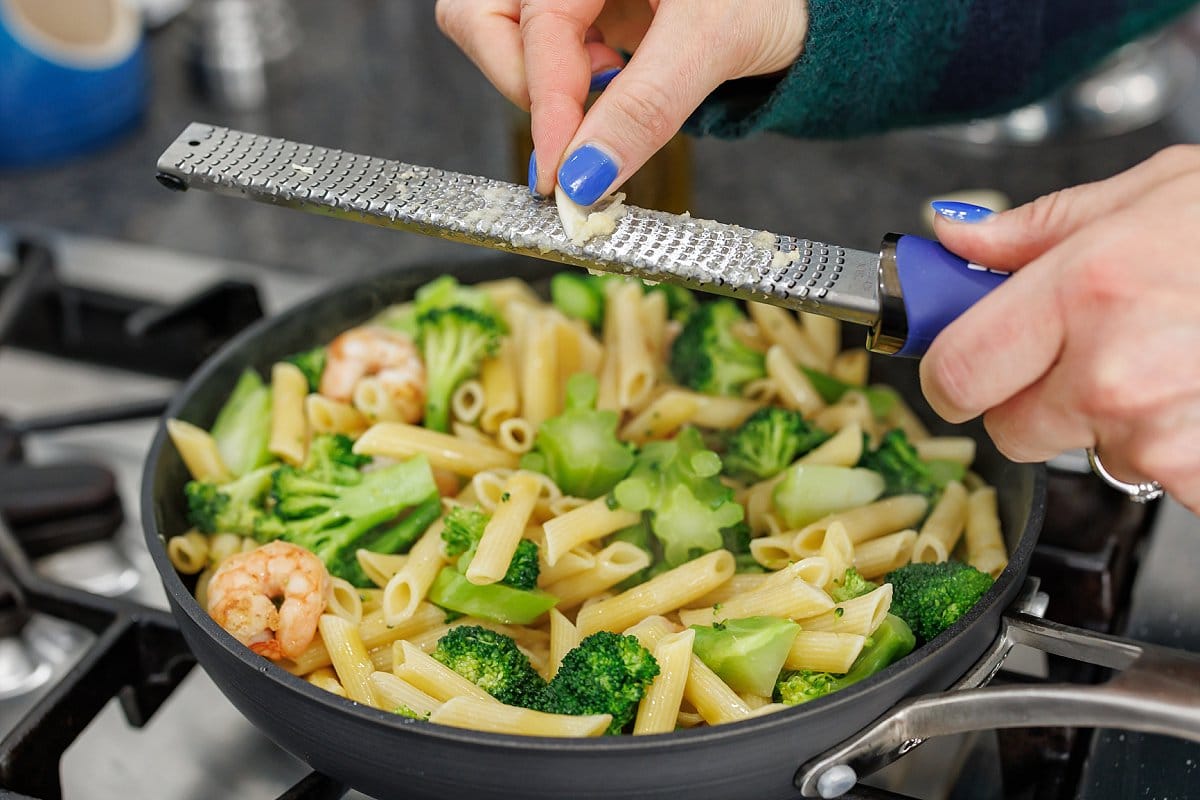 - Add reserved pasta and broccoli to the pan with the shrimp. Stir in remaining 2 tablespoons olive oil, lemon zest, and lemon juice. Toss well and add more salt or pepper to taste.1 juice and zest of lemon