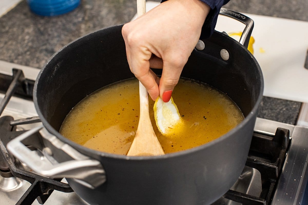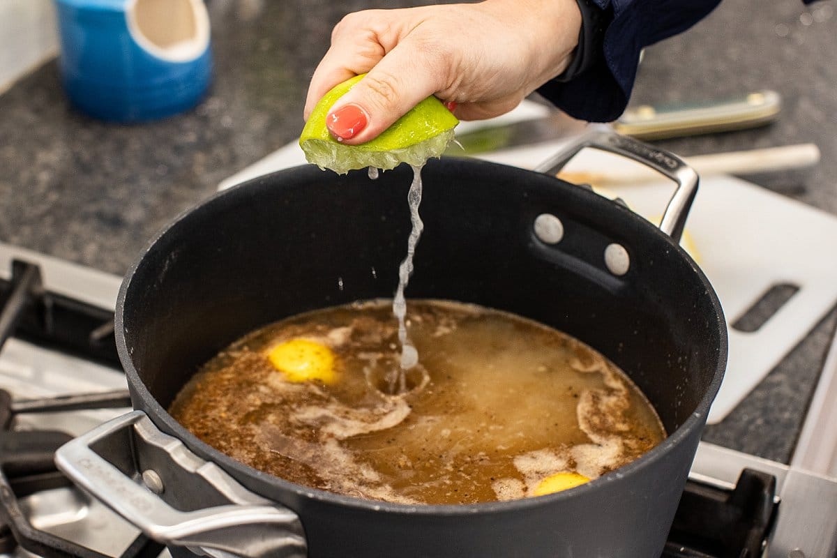 Next, you’ll be adding in the rest of the soup ingredients to simmer. I like squeezing fresh lime, but using lime juice is okay too!