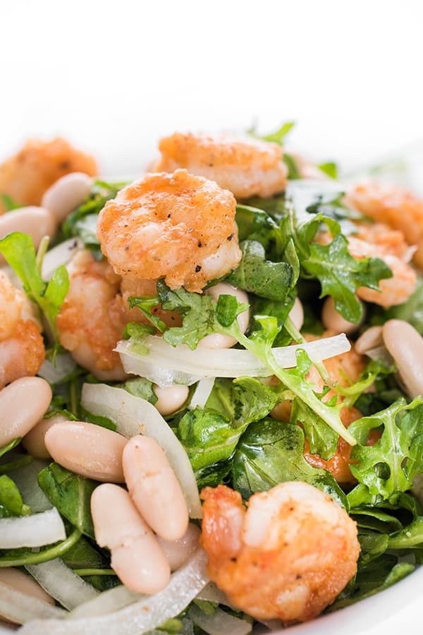I love arugula salads and almost always order one when I see it on a restaurant menu. Since my boys love shrimp and white beans I decided to turn my favorite side salad into a more hearty and satisfying entree salad.