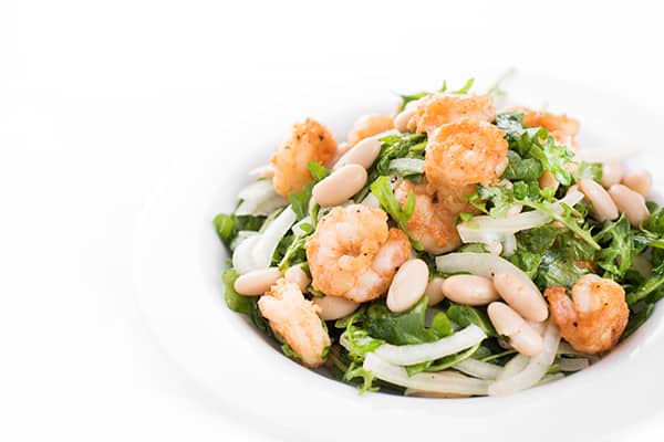 This fresh and flavorful arugula salad is topped with sautéed shrimp, sliced fennel and creamy white beans.