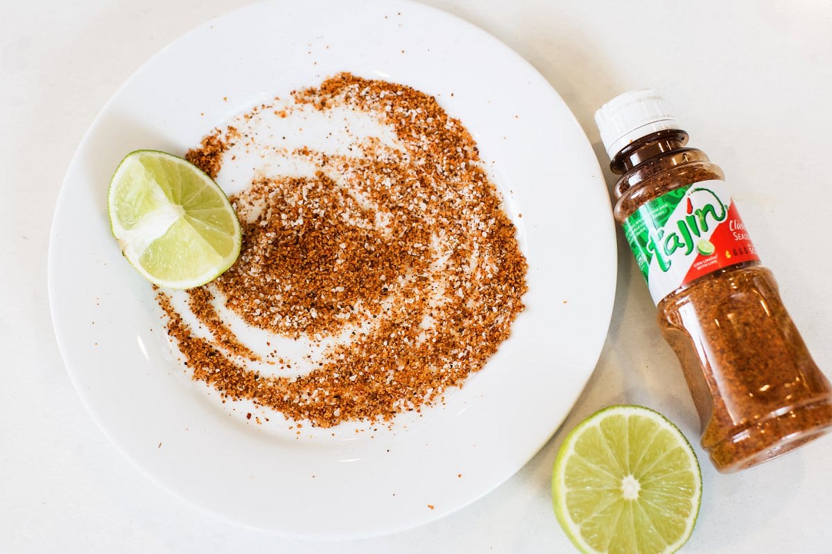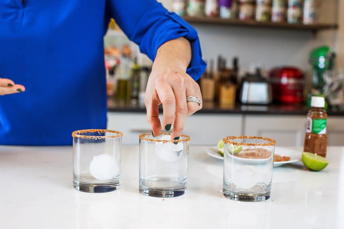To make this recipe, start by moistening the rim of your glasses with a lime wedge. Then, pour about ¼ cup of salt or tajín seasoning on a plate. Place the glasses rim down, and gently move them around the plate to coat with the salt. Fill each glass with ice and set aside.