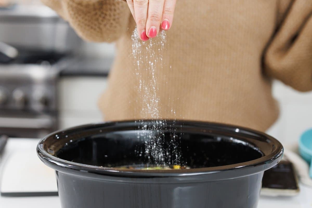 Add your minced garlic, and season with some salt and black pepper. Stir to combine, then put on the lid and cook on low for 8 hours, or high for 4.