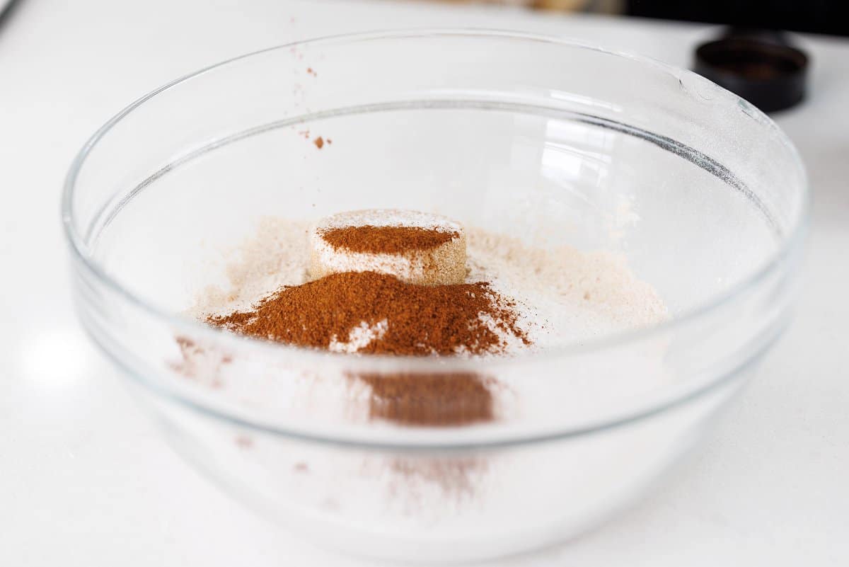 Start your slow cooker gingerbread oatmeal by mixing your sugar and spices in a bowl.