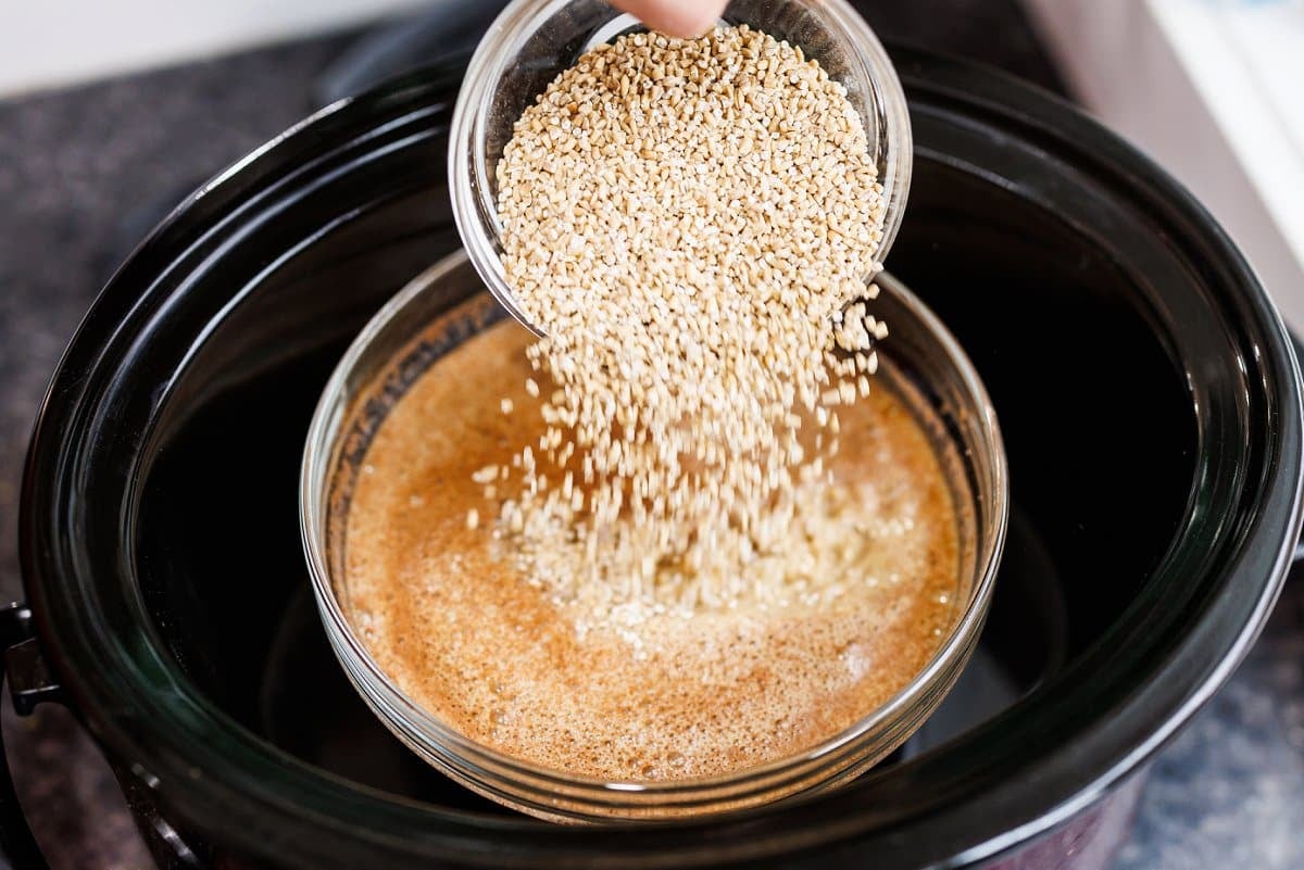 Add the mixture to your slow cooker, then stir in your steel cut oats. Cook on low overnight for 8 hours.