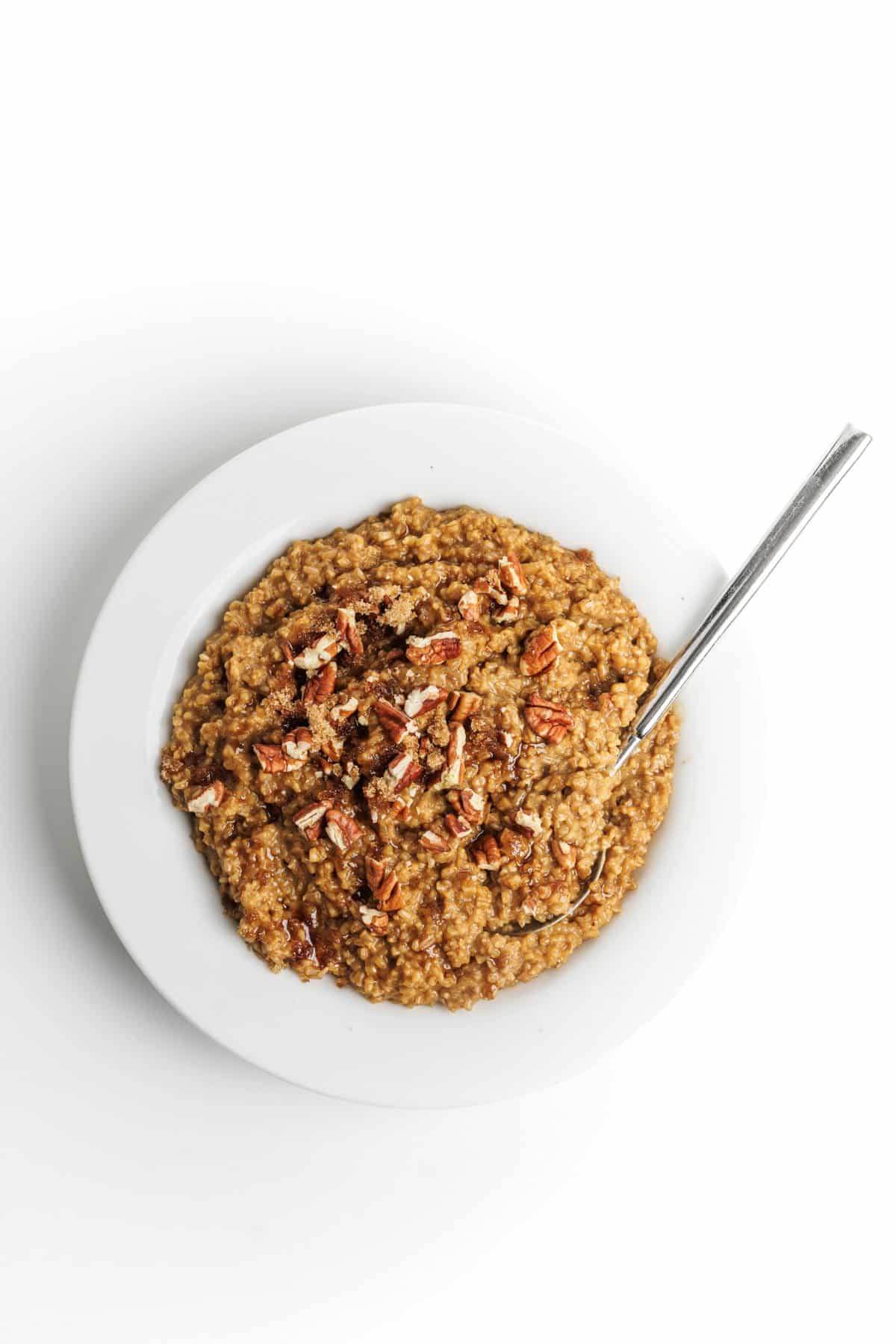 - In the morning, stir oatmeal with a fork to loosen the steel cut oats and make sure everything is fully incorporated. Serve warm with chopped pecans and additional brown sugar and molasses to taste.