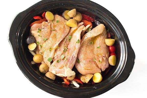 While we frequently grill sausage, peppers and onions, I wanted to create a “set it and forget it” slow cooker recipe that would still hit all of those flavors but wouldn’t require any hands-on work during dinner time. To lighten the dish a bit, I swapped out pork sausage for lean chicken breasts.