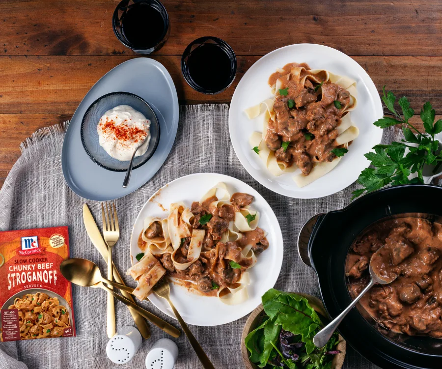 The traditional flavours of beef stroganoff come alive in this tender, slow cooked version. Just pop the meat and vegetables in your slow cooker, then mix in a McCormick Slow Cookers Chunky Beef Stroganoff Recipe Base for the perfect stroganoff. While the pack cuts out artificial colours, flavours, and MSG, it has rich and fragrant flavour in spades.