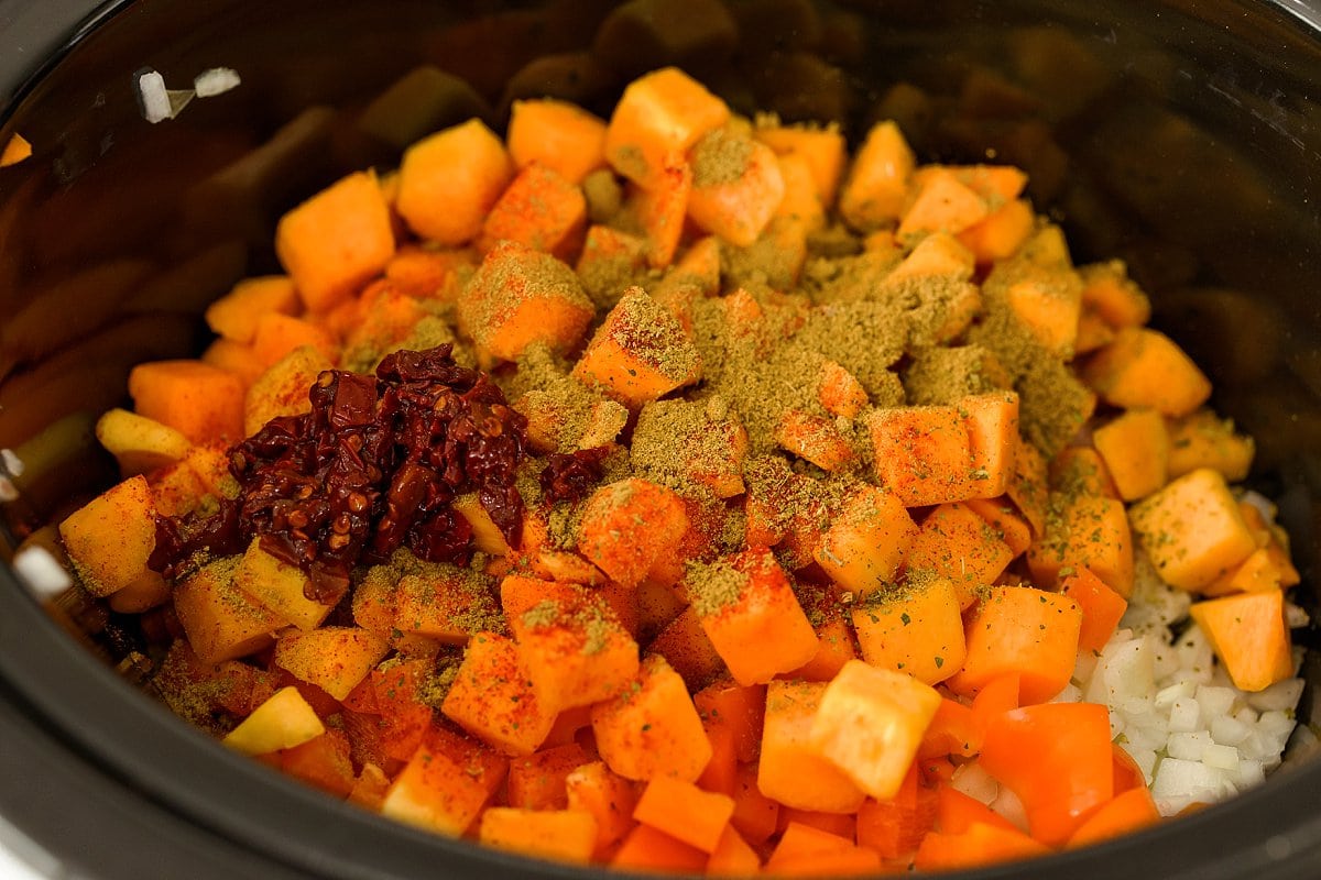 Then add the diced onion, red pepper, and butternut squash to your slow cooker.