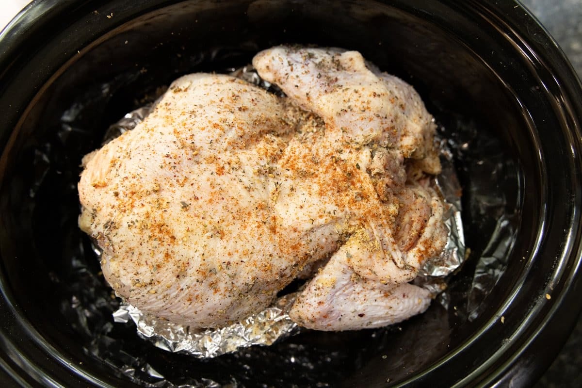 Cooking a whole chicken in the slow cooker is the easiest method to cook a chicken and results in tender, juicy chicken every single time.