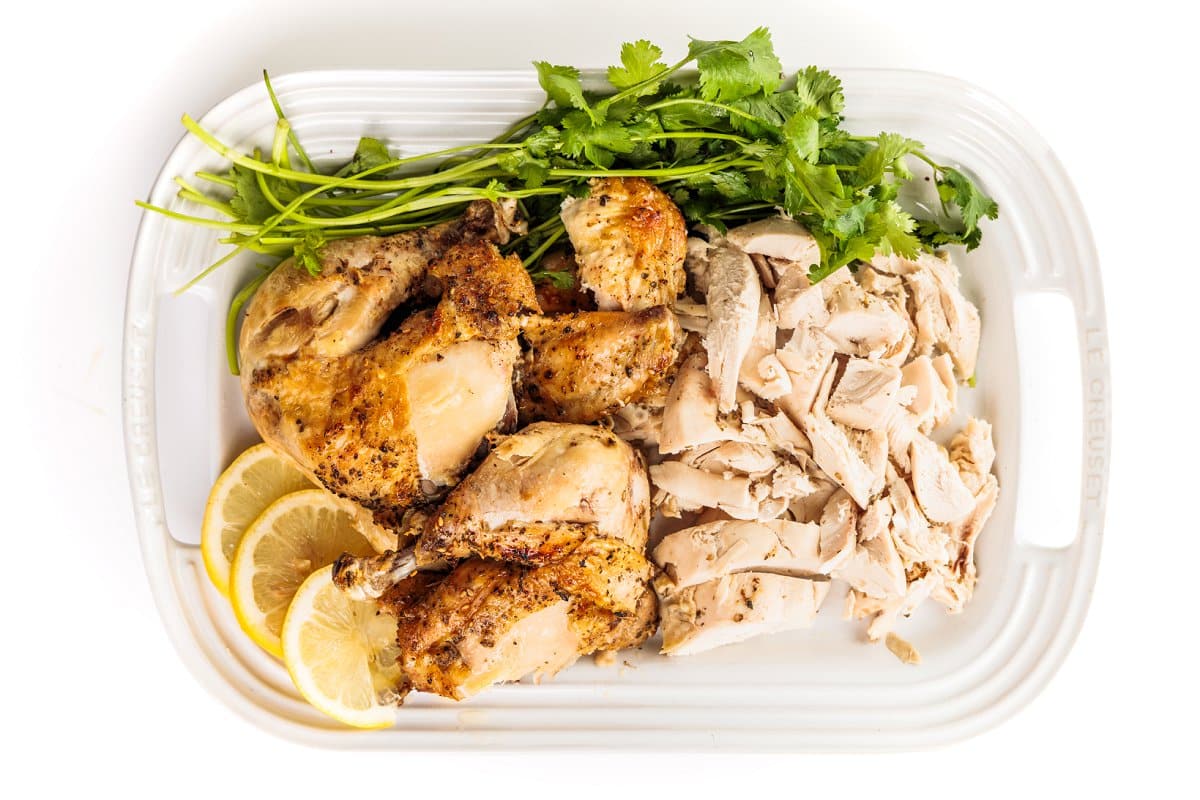 - This is optional but before serving, I recommend placing the chicken on a baking sheet and broiling until the skin is crispy, about 5-6 minutes. Serve sliced or shred up to use any way you wish.