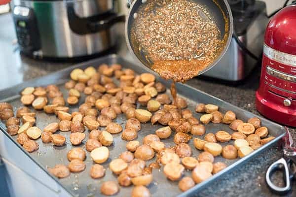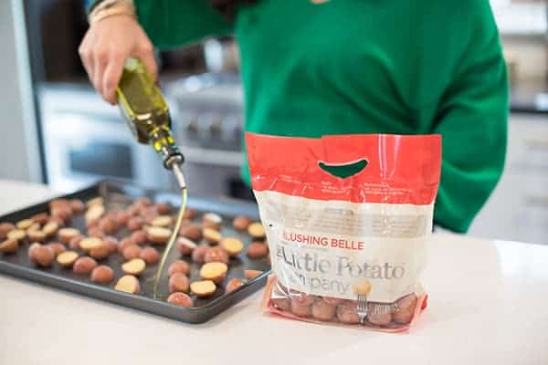 We happened to have a bag of Blushing Belle Little Potato Company creamers on hand but any variety will work. To start, simply halve them then roast with olive oil and salt until crispy.