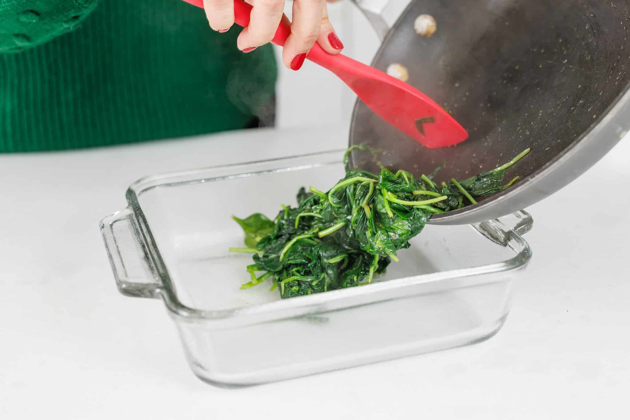 Remove from the stove, and put your spinach in a prepared baking dish.