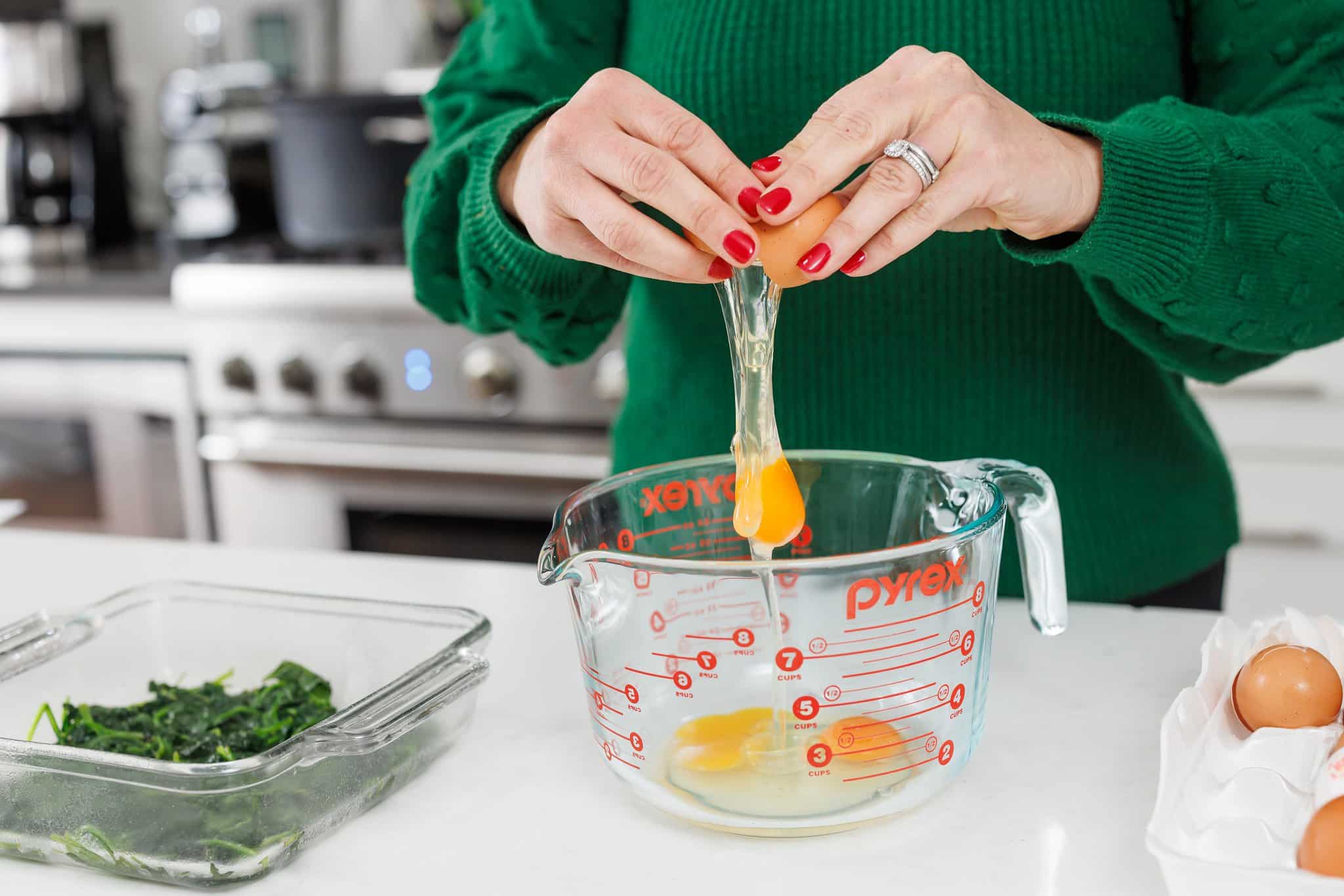 Once your eggs are all beaten, pour the mixture into the baking dish over the spinach.
