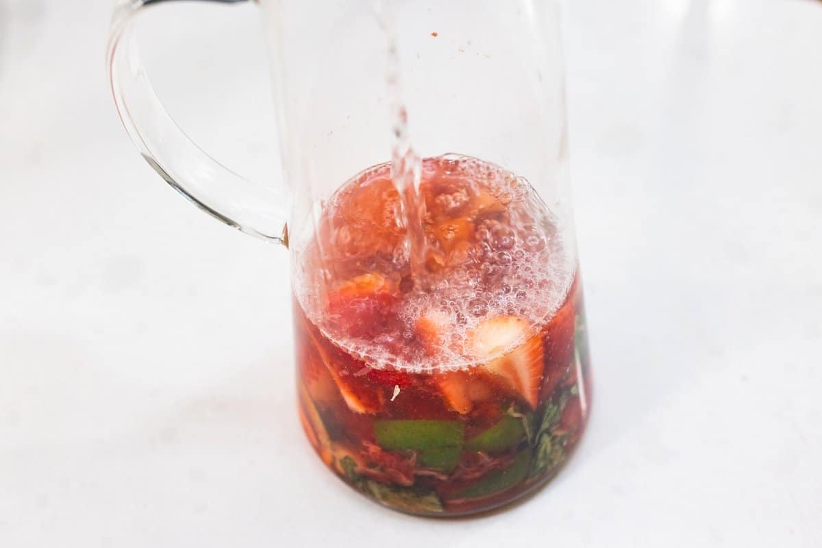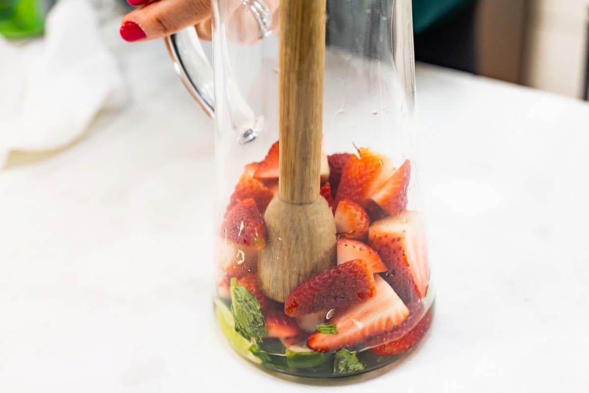 - Take one of limes and cut in half then quarter each half. Place lime wedges in a large pitcher along with mint leaves and strawberries. Using a muddler or the back of a wooden spoon start mashing the fruit and herbs together to release the flavors.