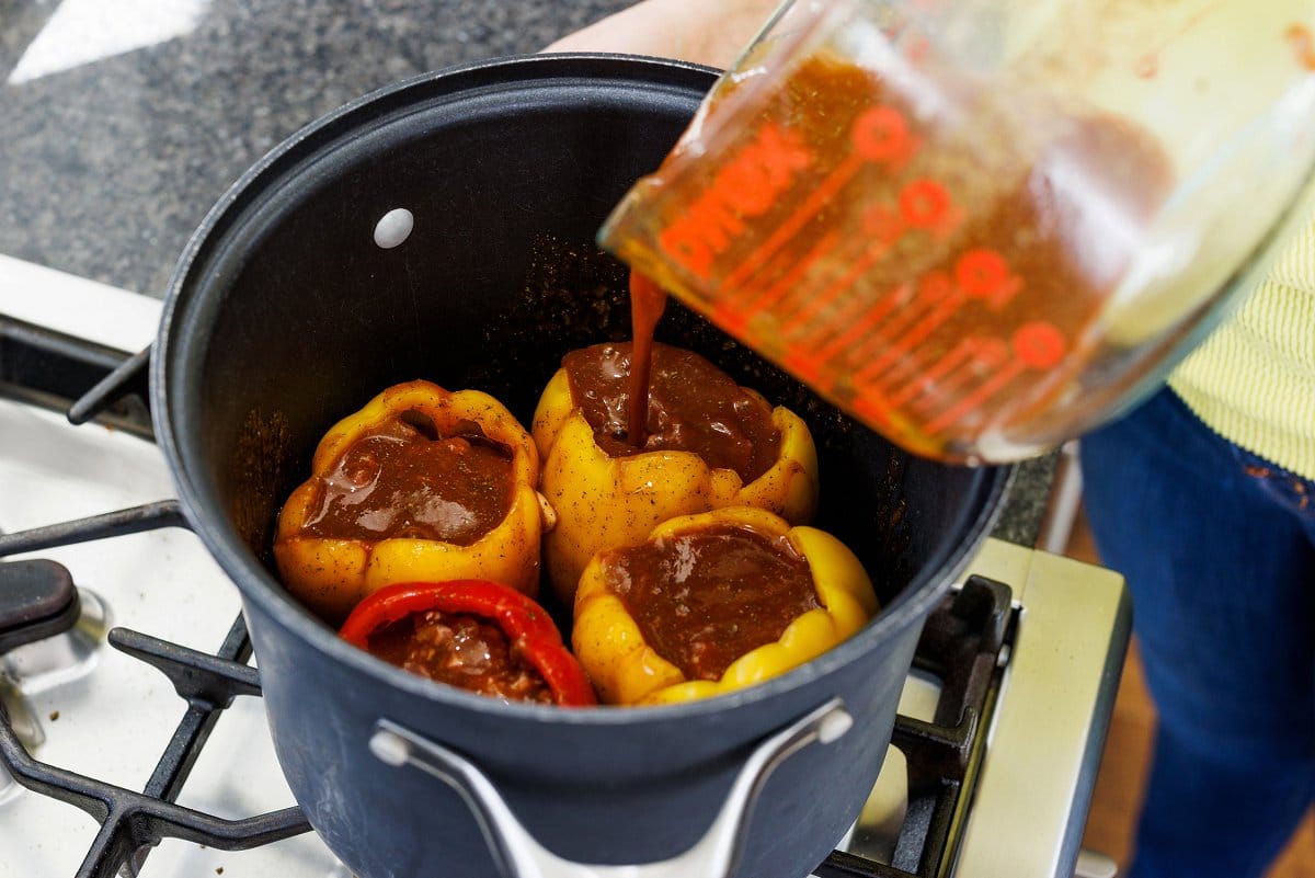 Take your tomato sauce and poor it over all of the peppers until they are fully covered. Bring to a boil, then reduce to a simmer for about 45 minutes.